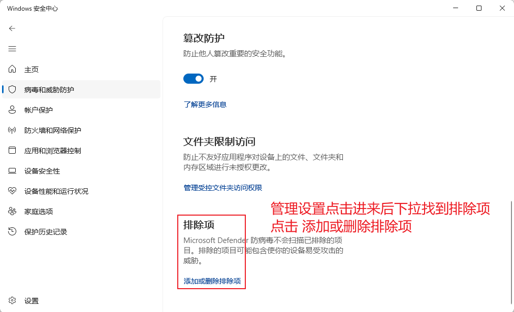Windows安全中心添加排除项