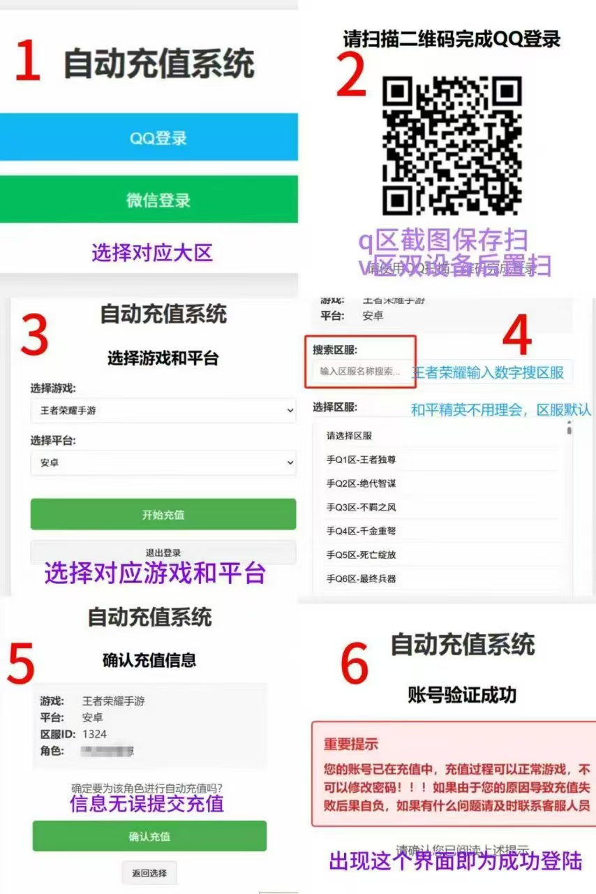 双击选择上号链接复制发送给客户进行扫码选区录入(客户比较笨就自己打开链接发二维码给客户然后索要大区信息),录入成功后会显示 您的号已经录入系统 正在充值
